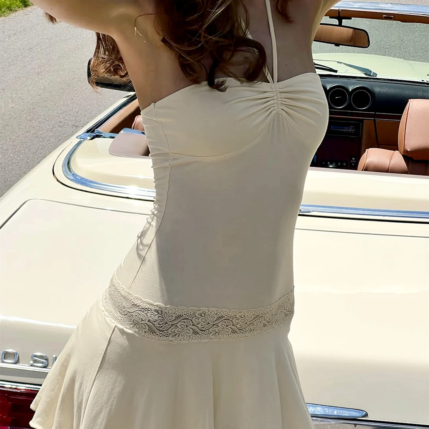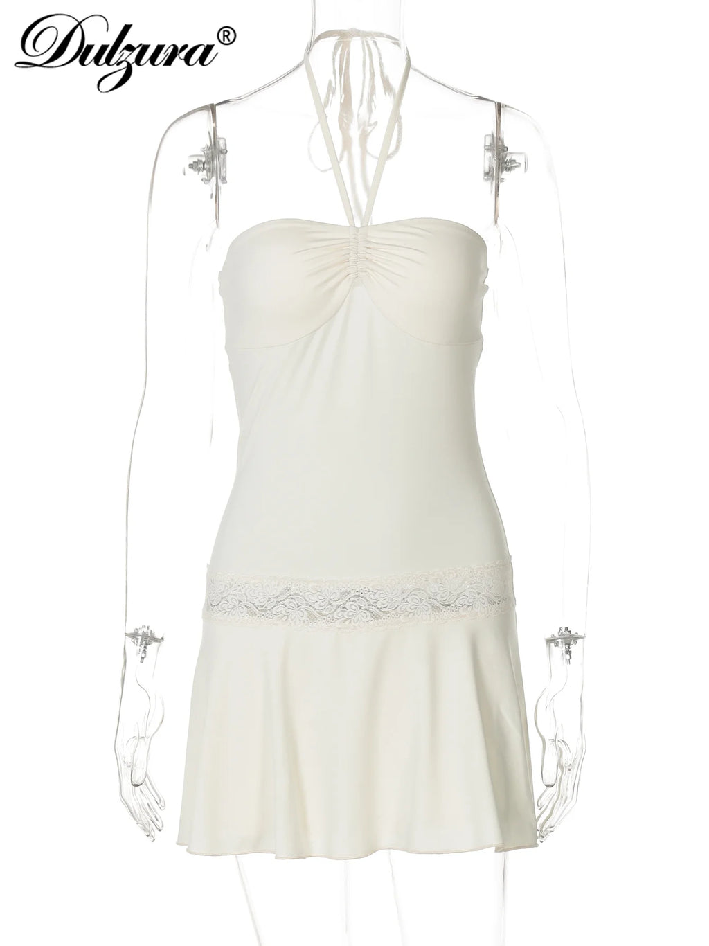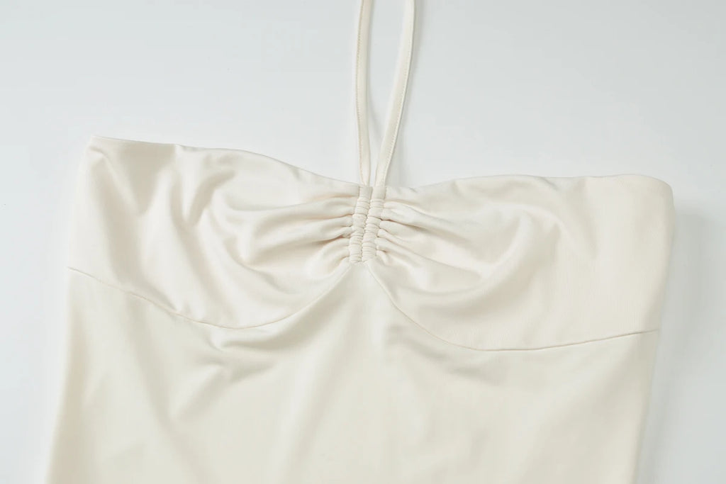 Com comprimento curto, decote halter e costas abertas, ele traz liberdade de movimento e um visual leve, ideal para praia, viagens, resorts e passeios de fim de tarde.